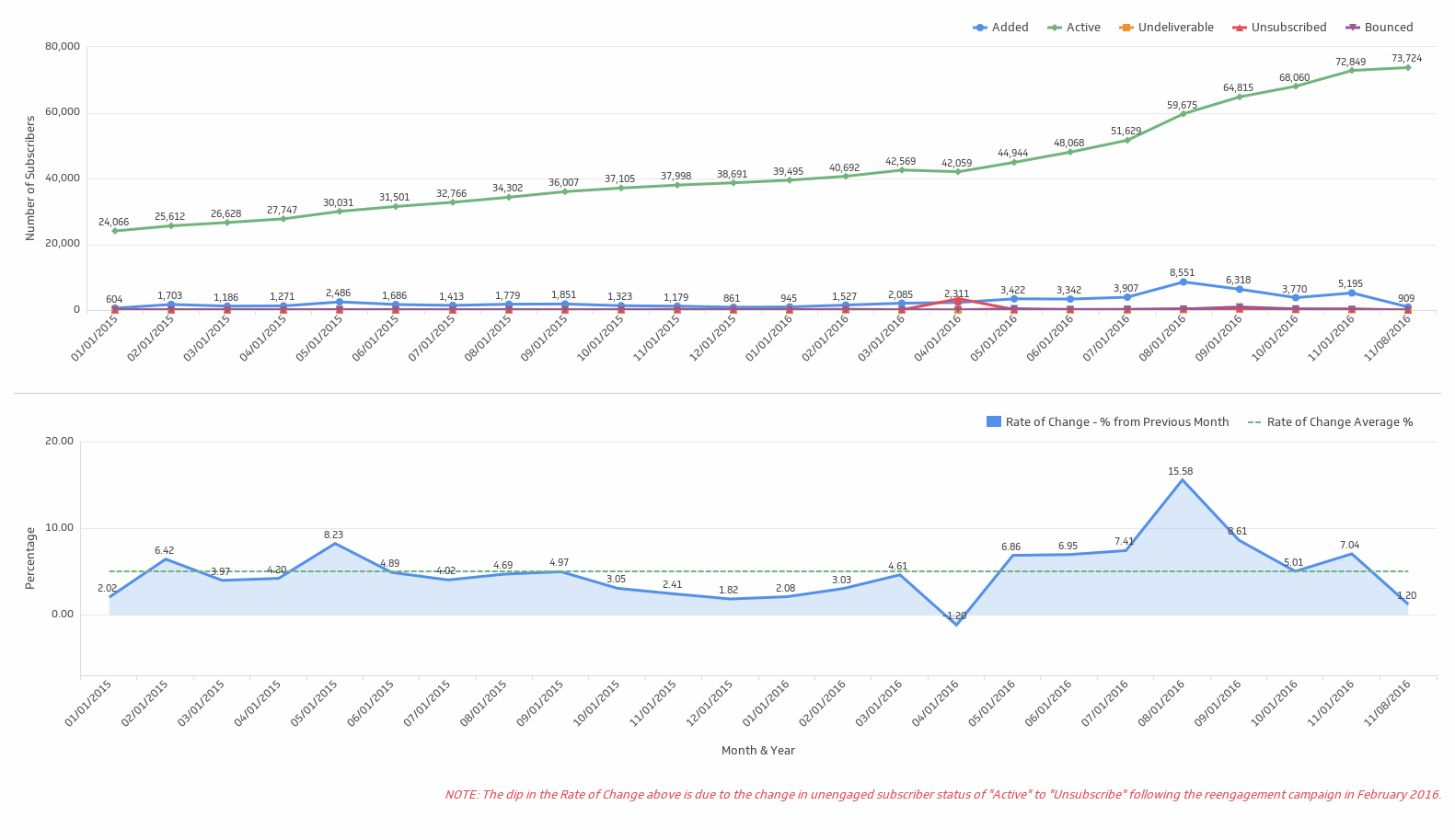A visual image can tell a greater tale than looking at a variety of spreadsheets or paragraphs of text. In the case of email marketing, using a dashboard is a good way to notice trends of key performance indicators (KPI’s) such as subscriber growth, engagement and conversion. Whether it’s growth or decline, pulling your data into a visual can save time in digging for answers or finding a quick solution.
